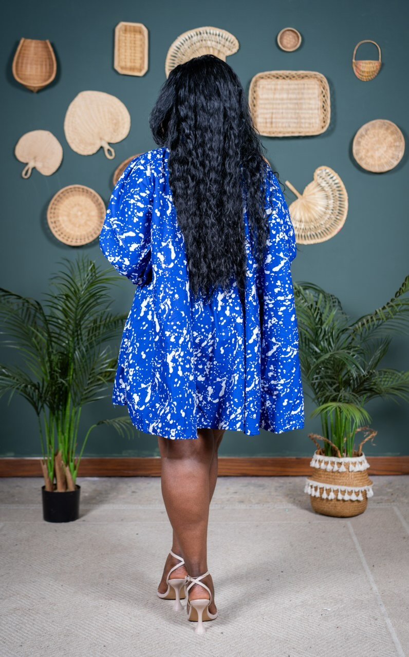 Turn heads and own every room in this statement-making Electric Blue Splatter Mini Dress. Designed in a bold cobalt blue with a chic white splatter print, this dress brings effortless glamour with a playful edge. The loose, flowy silhouette flatters every curve while keeping you comfortable, and the tiered hemline adds movement that makes every step feel runway-ready.